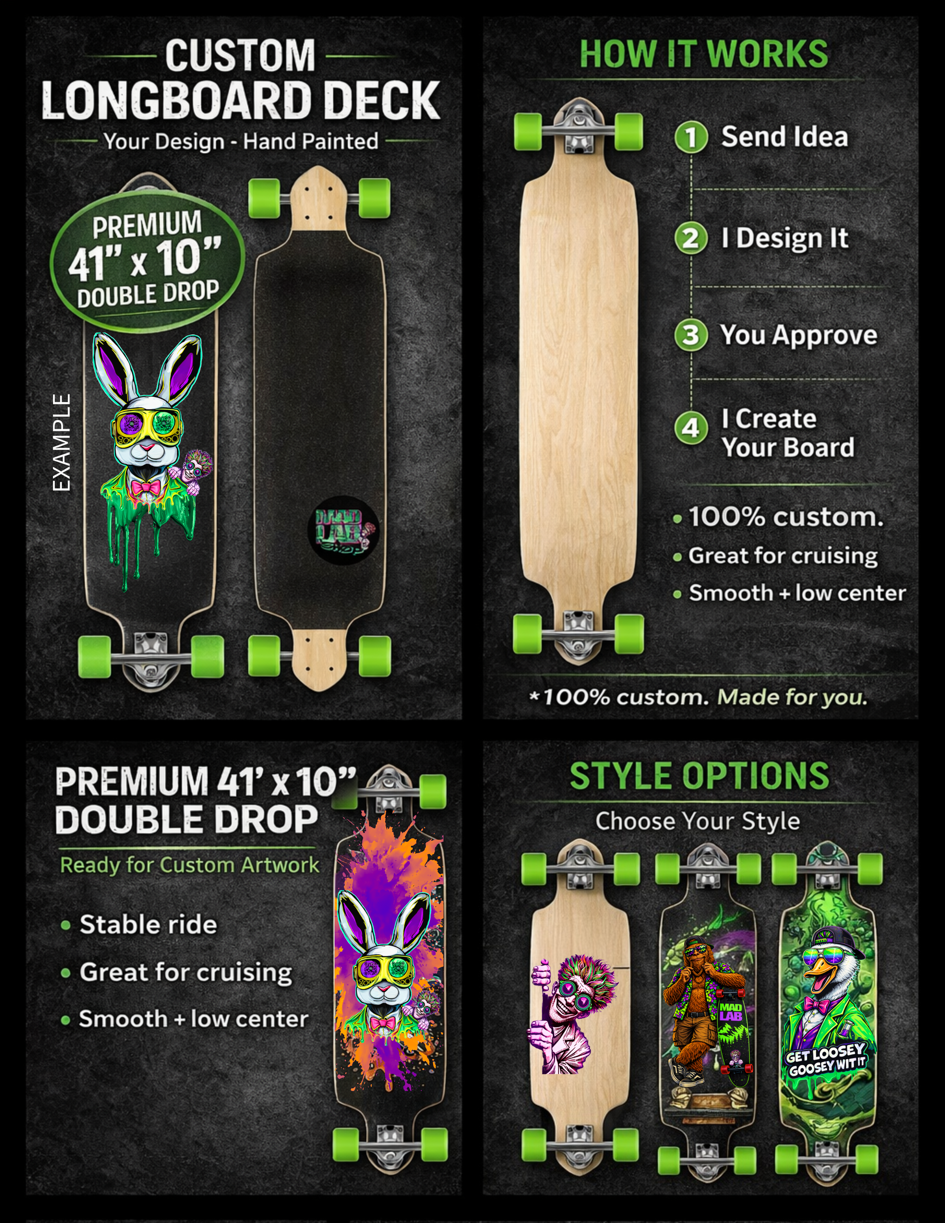 This is a custom, made-to-order double drop longboard — hand-painted from scratch just for you.